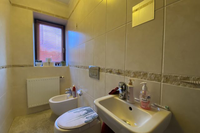 Előszobánkból, jobbra vendégszobánkba és az alsó szinten található, zuhanyzóval, toalettel felszerelt, dupla bejáratú fürdőszobánkba, balra háztartási helyiségünkbe, gardróbunkba és kazánhelyiségünkbe juthatunk, illetve 16 nm-es garázsunk is, az említett helyiségek, másik oldalán található.