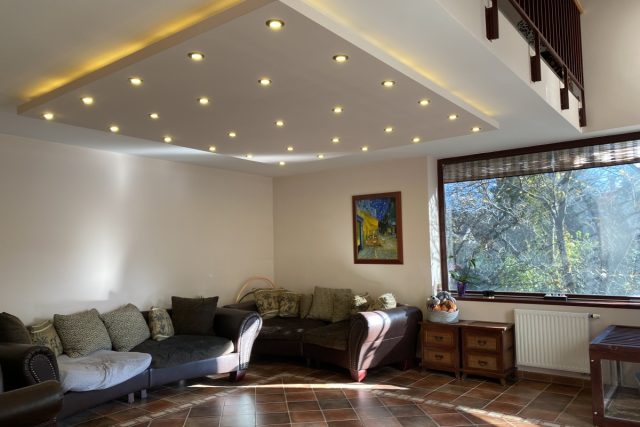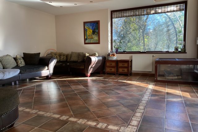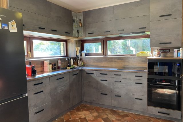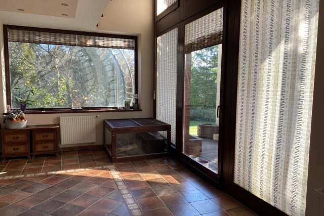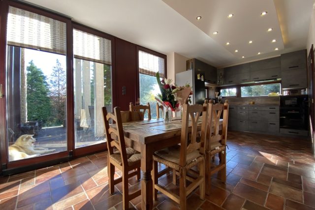 Új konyhánk, étkezőnk és óriási nappalink fényárban úszik a nagy, üvegfelületeknek, minőségi, fa nyílászáróinknak köszönhetően, ahonnan akár étkezőnkből, akár nappalinkból, tikfával borított teraszunkra is kiléphetünk.