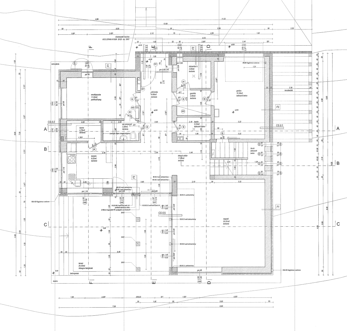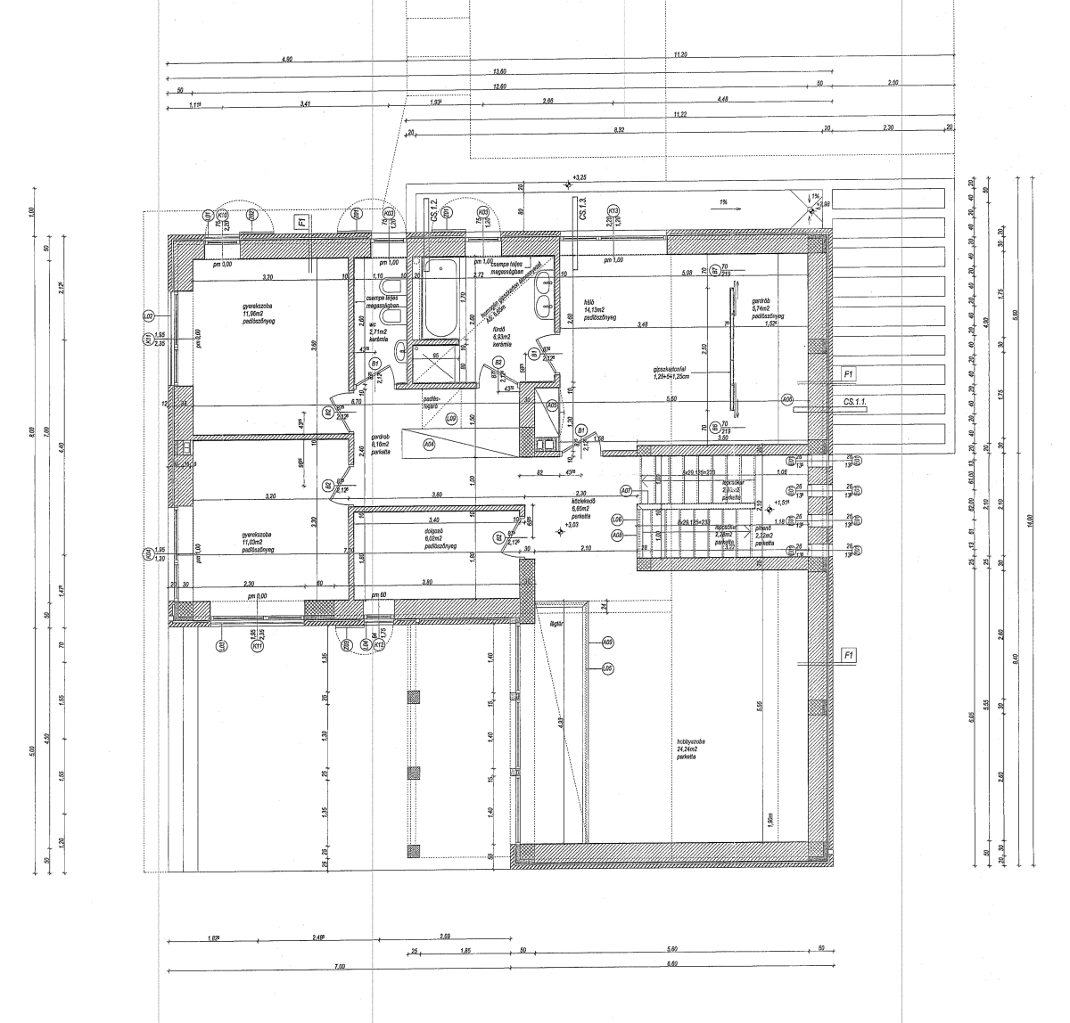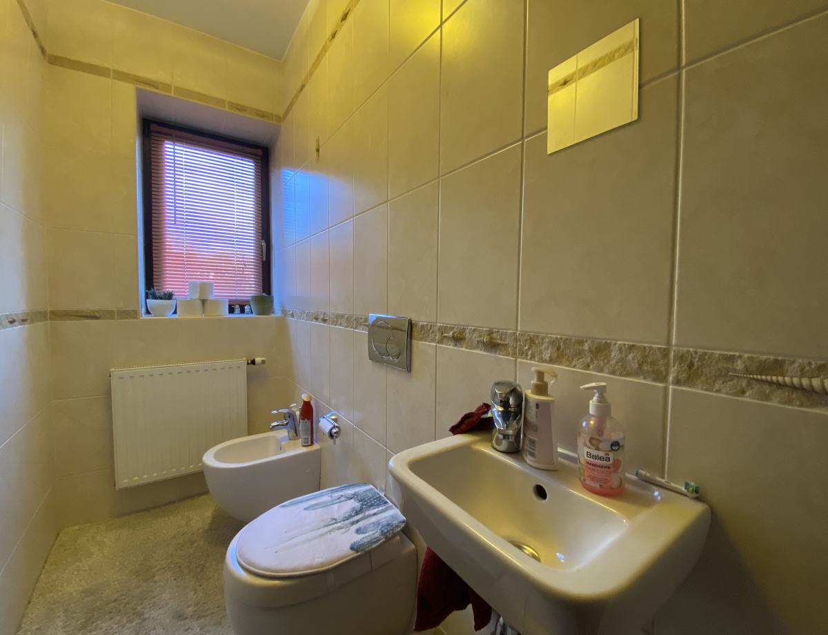 Előszobánkból, jobbra vendégszobánkba és az alsó szinten található, zuhanyzóval, toalettel felszerelt, dupla bejáratú fürdőszobánkba, balra háztartási helyiségünkbe, gardróbunkba és kazánhelyiségünkbe juthatunk, illetve 16 nm-es garázsunk is, az említett helyiségek, másik oldalán található.