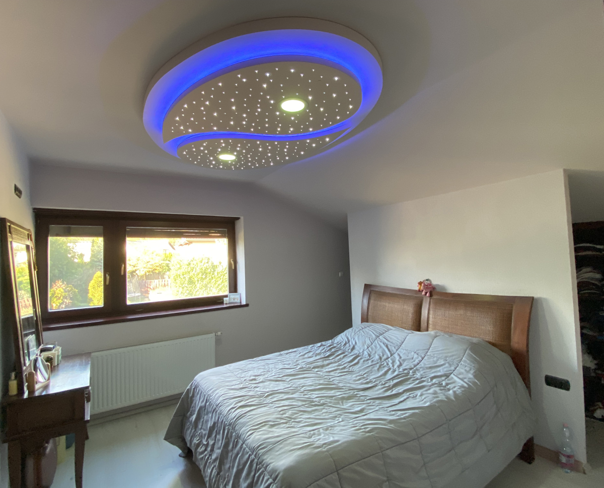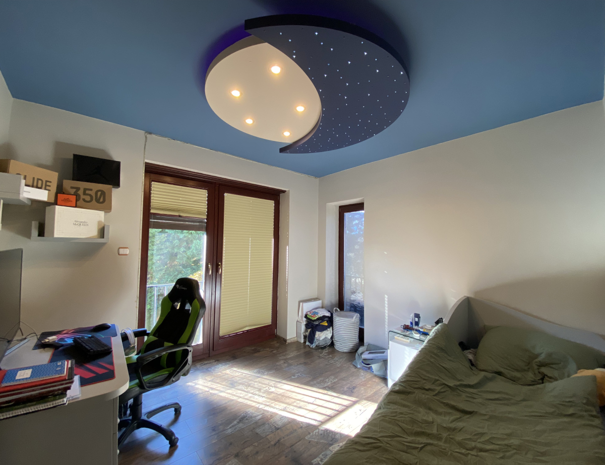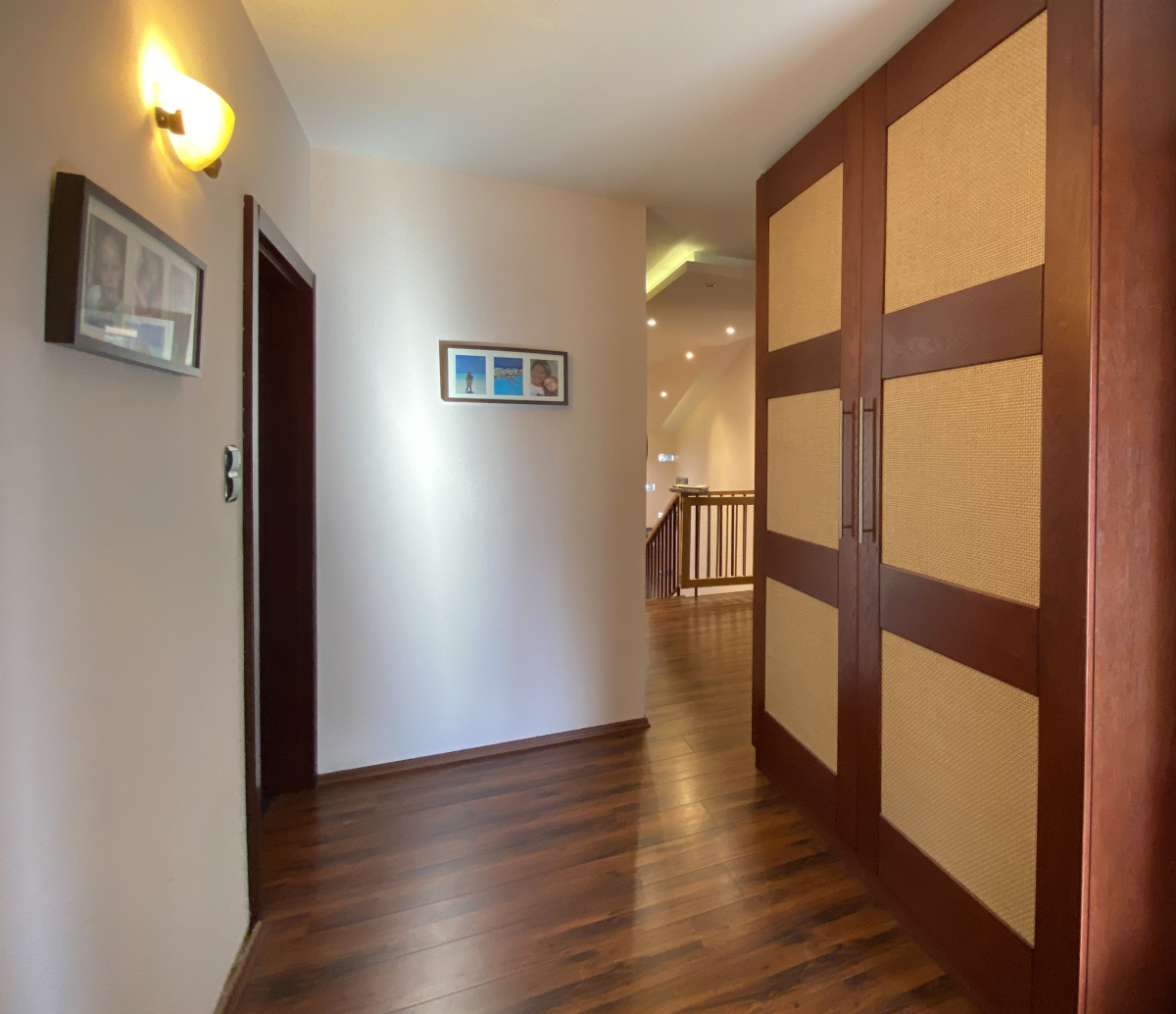 Közlekedőnkből, három különbejáratú hálószobába, melyből felnőtt hálónk, saját gardrobbal került kialakításra, káddal, zuhanyzóval felszerelt fürdőszobánkba, külön helyiségben található bidével is ellátott mellékhelyiségünkbe és dolgozószobánkba léphetünk.