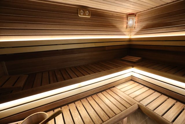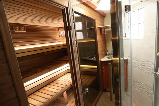 A ház alsó szintje is káprázatos. Hatalmas fogadásokra is alkalmas, 14 személyes étkezővel kialakított, szintén kandallóval ellátott terem fogad minket, amelyből a borospincénkbe is eljuthatunk. Ezen felül csodálatos panoráma szaunánk is itt található, kialakított pihenőrésszel.