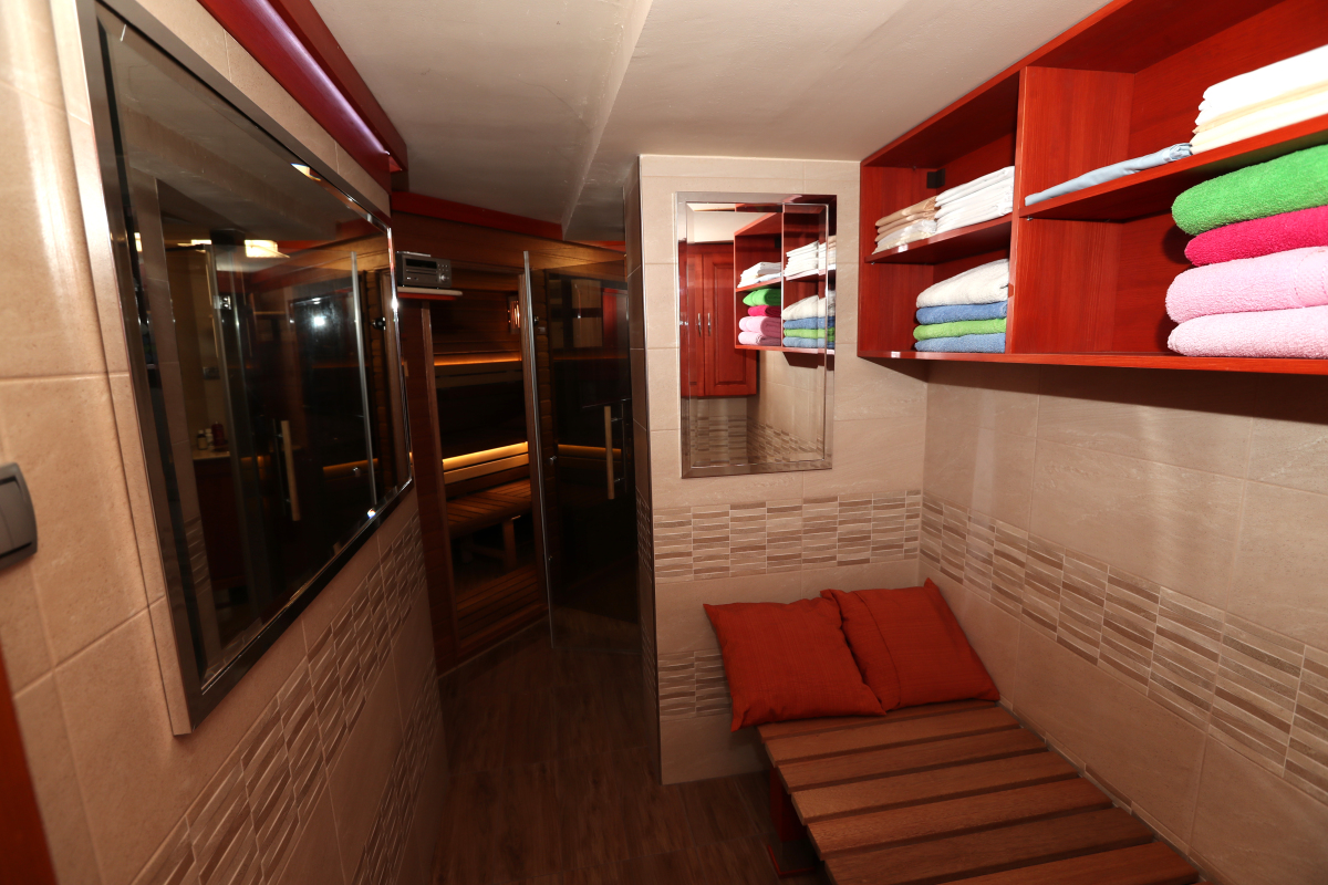 A ház alsó szintje is káprázatos. Hatalmas fogadásokra is alkalmas, 14 személyes étkezővel kialakított, szintén kandallóval ellátott terem fogad minket, amelyből a borospincénkbe is eljuthatunk. Ezen felül csodálatos panoráma szaunánk is itt található, kialakított pihenőrésszel.
